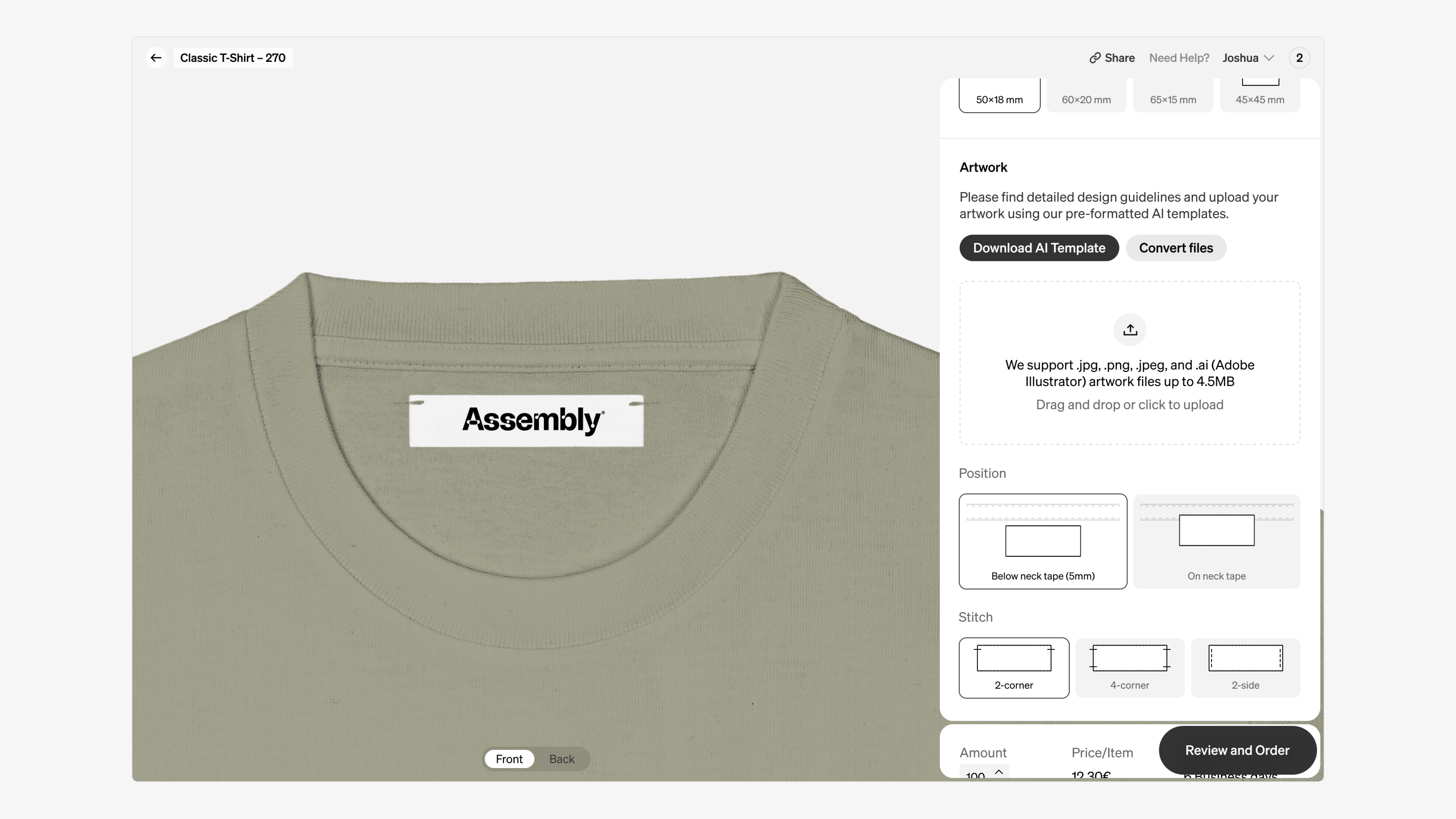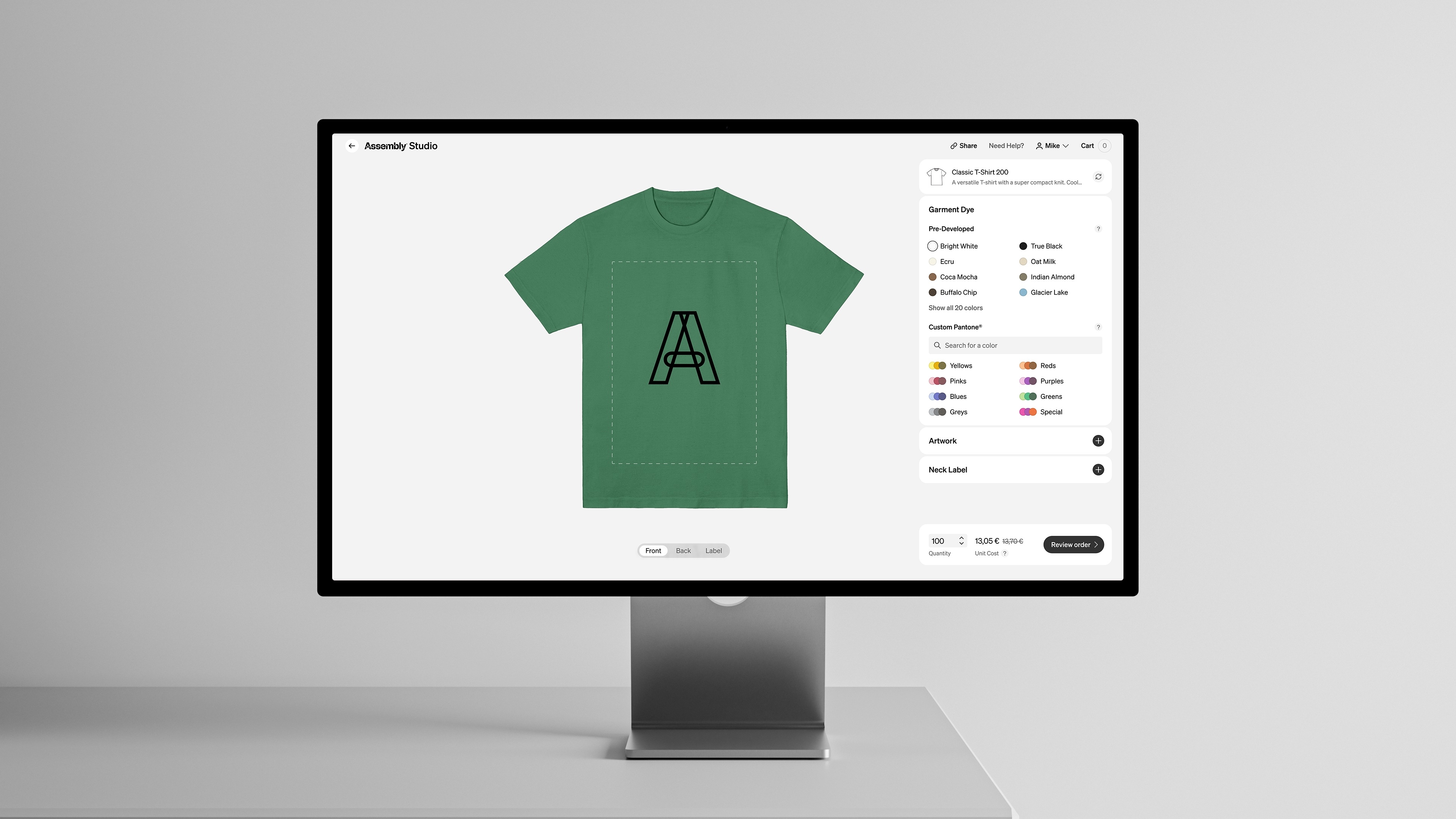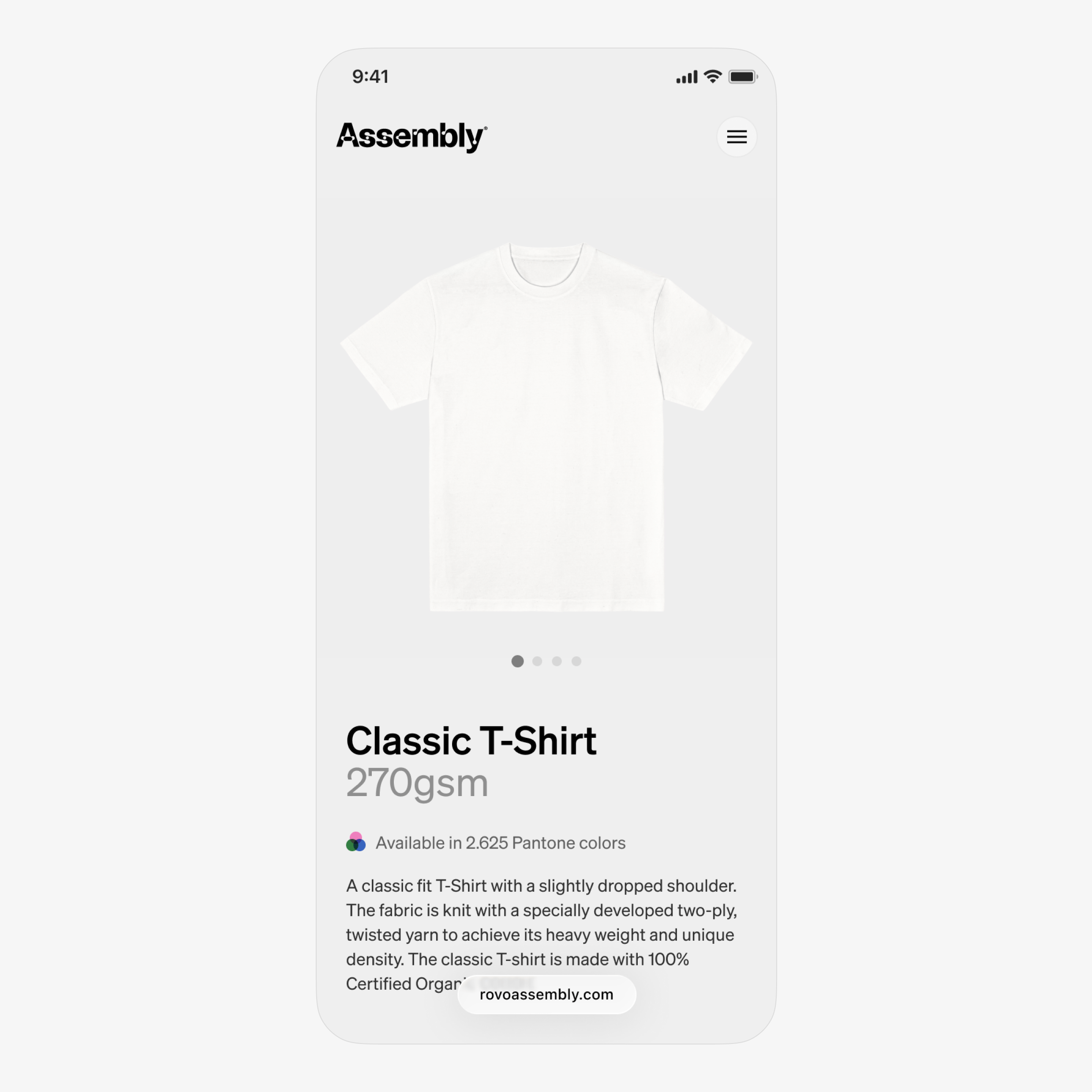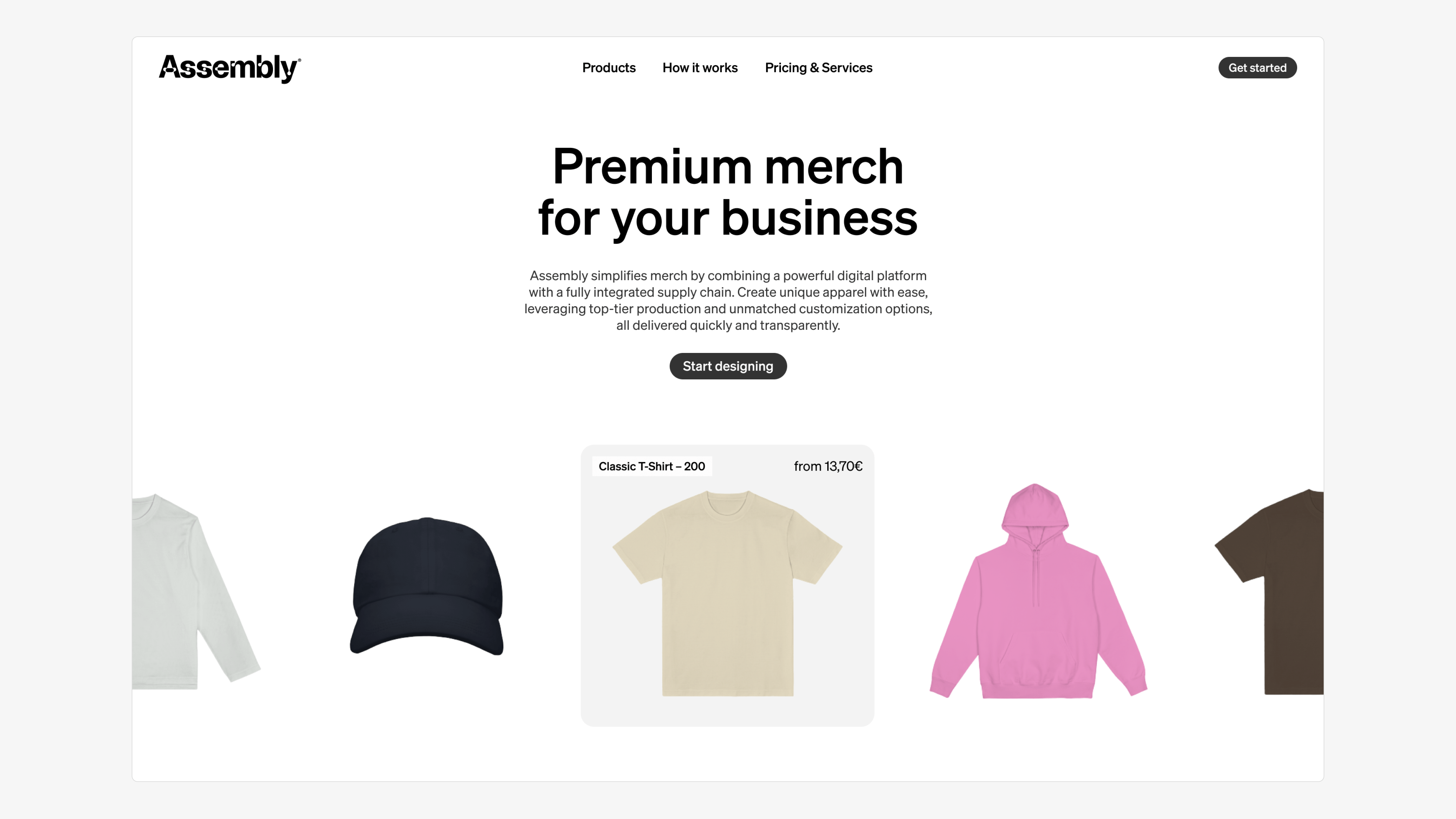 Assembly offers premium custom merch design through a digital platform, moving away from the hurdles of traditional design specs and endless email communication toward a hassle-free, self-service approach. Customers benefit from a fully integrated supply chain based in Portugal, which has produced for clients across both the luxury and streetwear worlds.